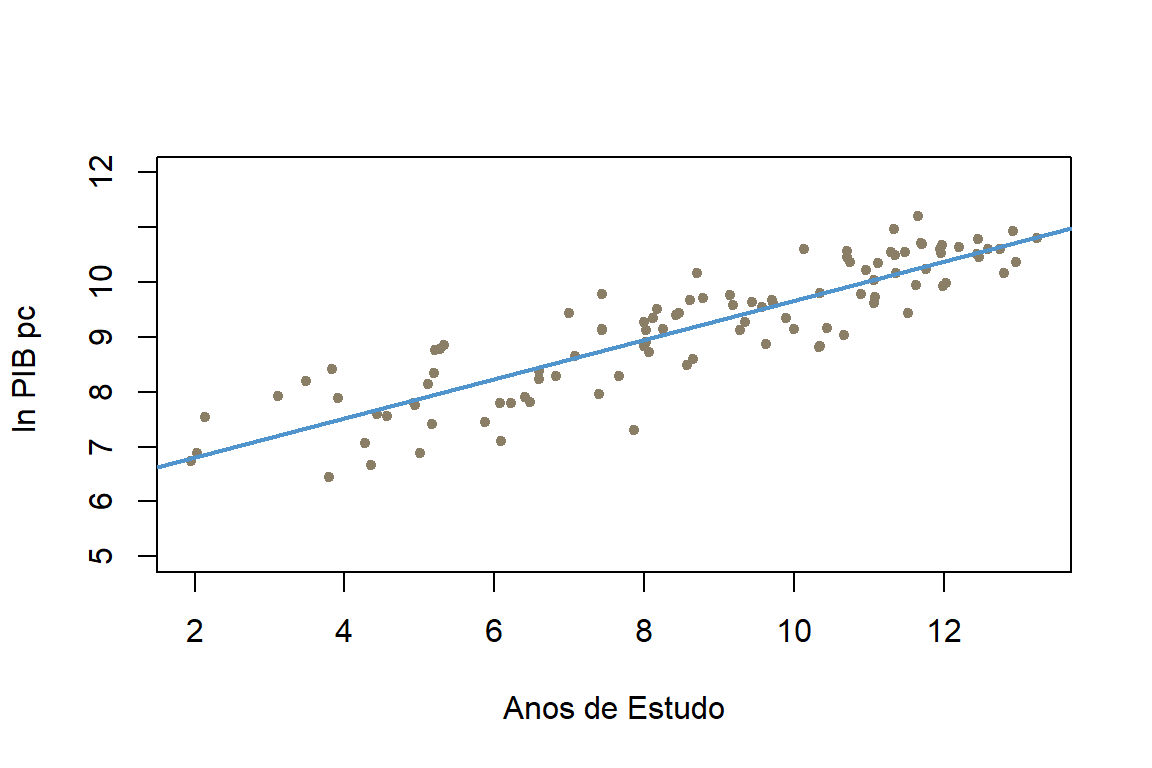 plot(bd$educa, bd$ln_salario, xlab="Anos de Estudo",