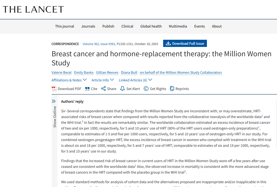 - Estudo: Beral, Valerie, et al. “Breast cancer and hormone-replacement therapy: the Million Women Study.” The Lancet 362.9392 (2003): 1330-1331