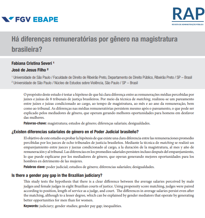 Estudo Severi, FC; Jesus Filho, J. “Há diferenças remuneratórias por gênero na magistratura brasileira?.” Revista de Administração Pública 56.2 (2022): 208-225.
