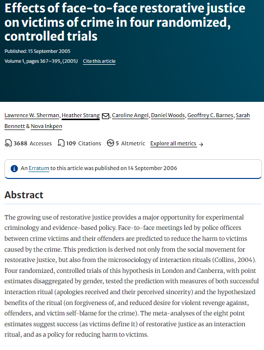 Objetivo: O estudo avaliou o impacto de programas de justiça restaurativa, onde as vítimas e ofensores se encontram em conferências mediadas, em casos de crimes violentos - quatro experimentos controlados.